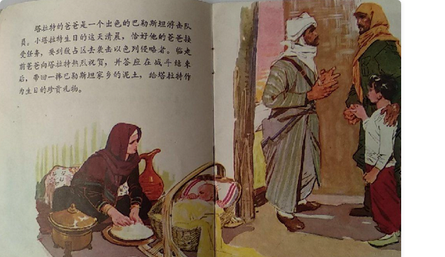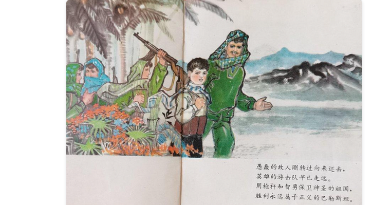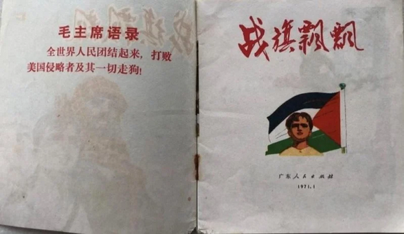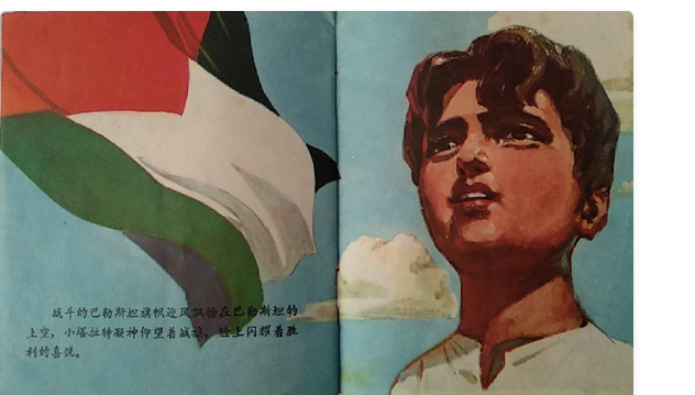 Curiosamente, la lucha armada palestina fue incluso un género de libros infantiles en China en la década de 1970. En 1971, una editorial estatal de Guangdong compuso y publicó un cómic para niños titulado La bandera ondeante del combate. Talat, el protagonista de esta historia, es hijo de un guerrillero palestino que planea «lanzar una operación contra los invasores israelíes en el territorio ocupado». La mañana del decimotercer cumpleaños de Talat, su padre prometió traerle un tarro de tierra de Palestina como regalo de cumpleaños. En lugar de esperar, Talat participó ese mismo día en la guerrilla y recibió el regalo de cumpleaños que siempre había deseado: la guerrilla derrotó por completo a los israelíes y la bandera de Palestina ondeó en los territorios liberados.8.