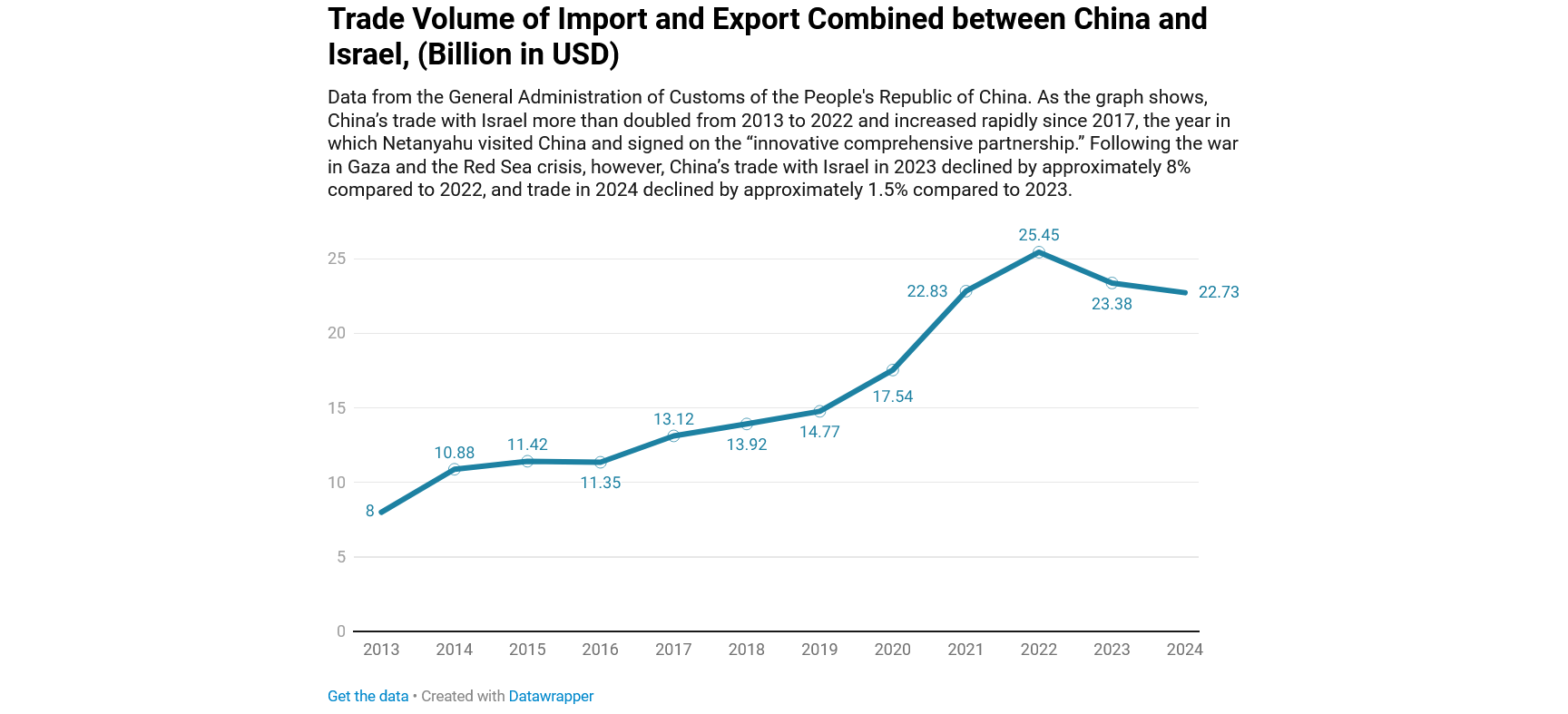 Sin embargo, los intereses económicos, en particular la alta tecnología, alimentaron el creciente interés de China en Israel. Además, dado que la relación de China con el presidente estadounidense Donald Trump durante su primera administración (2017-2021) fue terrible, ya que se cortaron la mayoría de los canales de comunicación entre China y EE. UU., China también trató de invitar a Israel a actuar como puente para mantener el contacto con EE. UU.