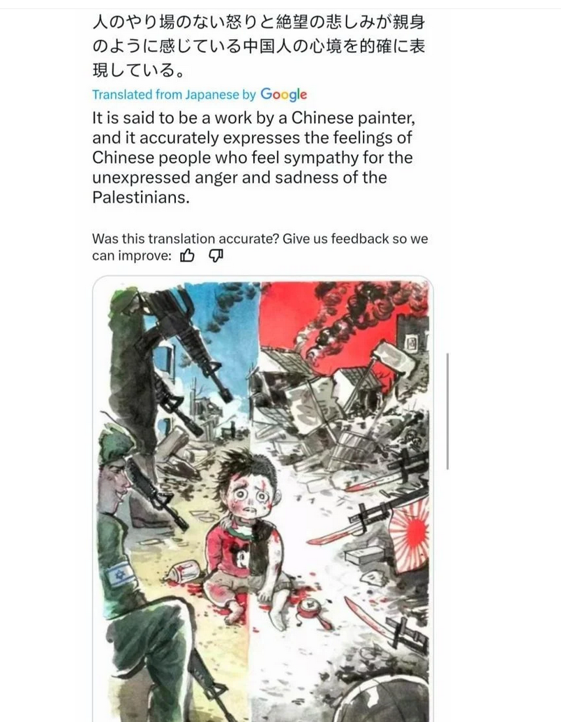 Curiosamente, aunque el Estado chino nunca ha adoptado directamente esta comparación en declaraciones oficiales o documentos gubernamentales, ha mostrado implícitamente simpatía por ella. China Daily, un medio oficial del Estado, emitió una entrevista a Fariz Mehdawi, embajador palestino en China, en la que comparaba al pueblo palestino actual con los civiles chinos de Nankín que sufrieron bajo la ocupación japonesa durante la Segunda Guerra Mundial («Balesitan zhuhua dashi» 2023). Xue Jian, cónsul general chino en Osaka, Japón, incluso compartió una pintura, creada por el joven pintor Zhou Sheji, en su cuenta oficial de Twitter (enlace externo), que compara vívidamente a los soldados israelíes con los fascistas japoneses que masacraron a niños chinos durante la Segunda Guerra Mundial.19
