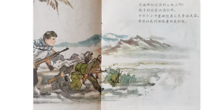 Un año después, en 1972, la misma editorial publicó otro cómic para niños llamado El pequeño héroe Qassam. En esta historia, el pequeño Qassam, un niño palestino cuyo padre fue asesinado por los israelíes en la guerra de 1967 y tuvo que huir a Ammán como refugiado, se unió a la guerrilla a la edad de catorce años. Disfrazado de niño corriente que transporta sus pertenencias en un burro, el pequeño Qassam condujo hábilmente a los soldados israelíes a la emboscada de la guerrilla y destruyó así un bastión del ejército israelí.9. Este cómic fue tan popular que en 1973 la historia del pequeño Qassam se recreó en un largo poema con pinturas de artistas de otra editorial estatal con sede en la provincia de Heilongjiang. 10.