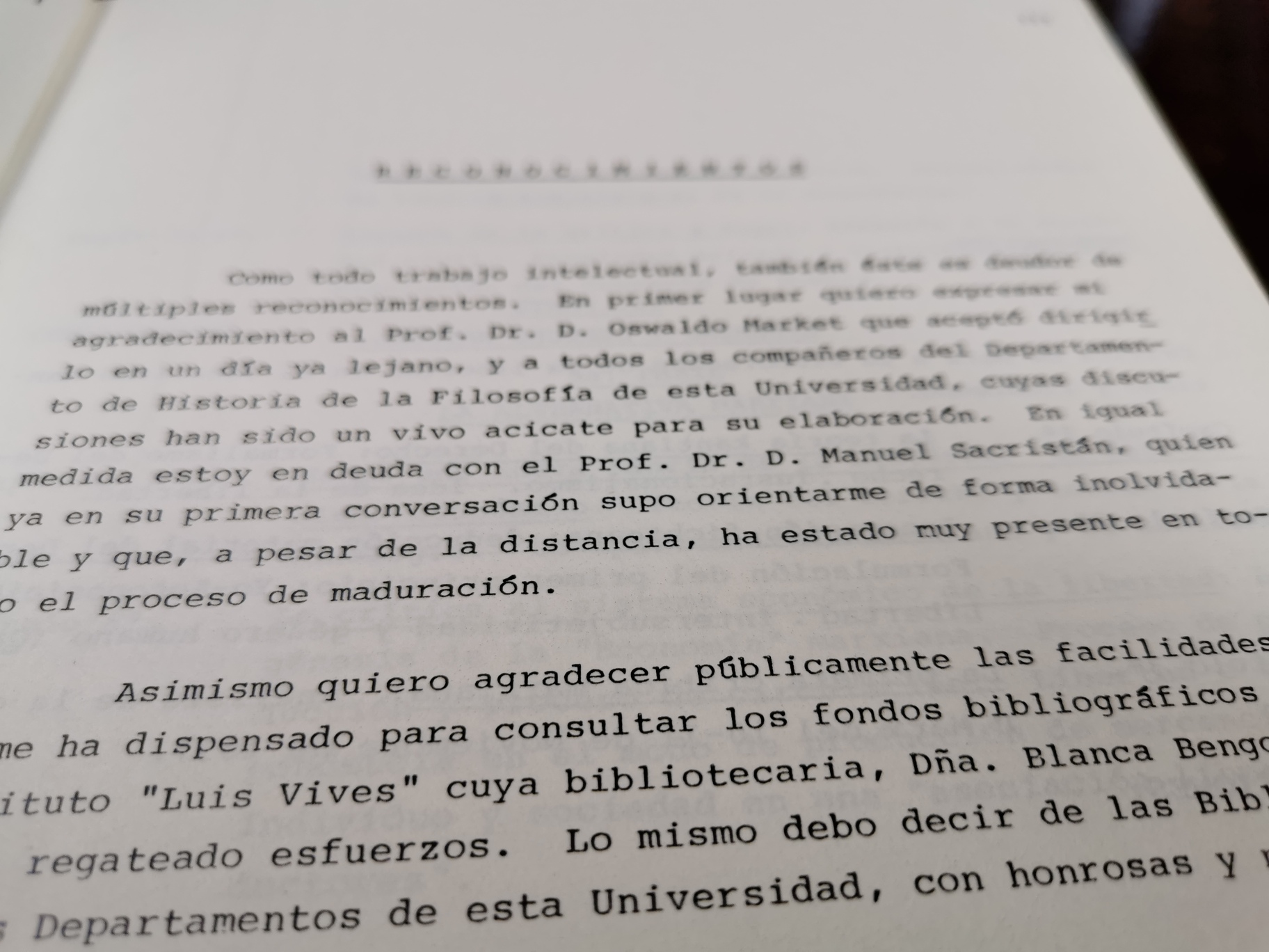 Me pregunto por qué alguien que ya conoce bien la lógica formal, se pone a hacer una tesis sobre Heidegger a su vuelta a España. Pienso que lo hizo porque aquí no podía seguir con la Lógica: ni había tradición de esa disciplina ni aparatos adecuados. Pero centrarse en Heidegger y en este tema me parece un retroceso en su maduración intelectual. Fernández Buey en su Prólogo a la reedición del libro, indica la continuidad de ese trabajo con otros artículos anteriores publicados especialmente en Laye. También insinúa que el texto ofrece una contribución a la discusión del momento, cuando Heidegger era, por una parte, uno de los autores más leídos y, por otra, había un cierto interés por marcar su continuidad con el pensamiento escolástico tradicional y con el nacional-catolicismo. Son aspectos a tener en cuenta: verlo como una contribución a la polémica cultural de la época.