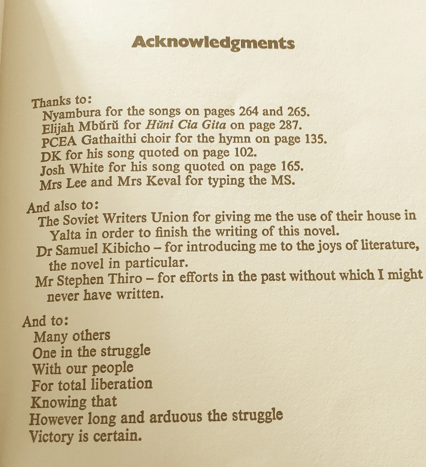 Leí Pétalos de sangre por primera vez en 1987 y desde entonces lo he releído muchas veces y lo he enseñado dos veces. Es un libro maravilloso sobre la condición poscolonial y debería haberle valido a Ngũgĩ todos los premios imaginables. De hecho, ganó varios en la década de 1970, siendo el más significativo para él el Premio Lotus de Literatura de 1973, otorgado por la Asociación de Escritores Afroasiáticos en Alma Ata (URSS). Muchos años después, Ngũgĩ me confesó que ese premio era el que más apreciaba. La página de agradecimientos de Pétalos de sangre es reveladora. Ngũgĩ da las gracias a la «Unión de Escritores Soviéticos por permitirme utilizar su casa en Yalta para terminar de escribir la novela». No da las gracias a nadie más de esa manera.
