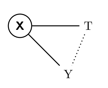 En el siguiente DAG, beber demasiado la noche anterior está representado por X; T representa dormir con los zapatos puestos e Y levantarse con dolor de cabeza. La línea discontinua muestra la correlación entre T e Y, que no es una relación causal, sino estadística, y con la que, a su vez, podemos mostrar gráficamente que el ACE y la correlación no son equivalentes.