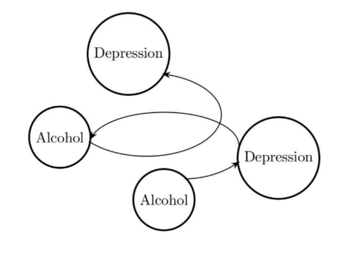 Eleanor J. Murray y Zachary J. Kunicki (Murray y Kunicki, 2022) proponen una estructura de tipo espiral en la que una variable afecta a la otra de forma cronológica. Estos dos autores plantean una lectura alternativa al ejemplo de la relación causal entre alcohol y depresión, una relación muchas veces caracterizada como un bucle de retroalimentación en la que el efecto pasa a ser causa. Para ellos, este tipo de bucles en realidad serían efectos bidireccionales ordenados temporalmente, razón por la que pueden ser representados por los DAG. En esta línea, Philip Boeken y Joris M. Mooij (Boeken y Mooij, 2024) introducen el concepto de SCM dinámicos, las variables endógenas de los cuales representan funciones de tiempo.