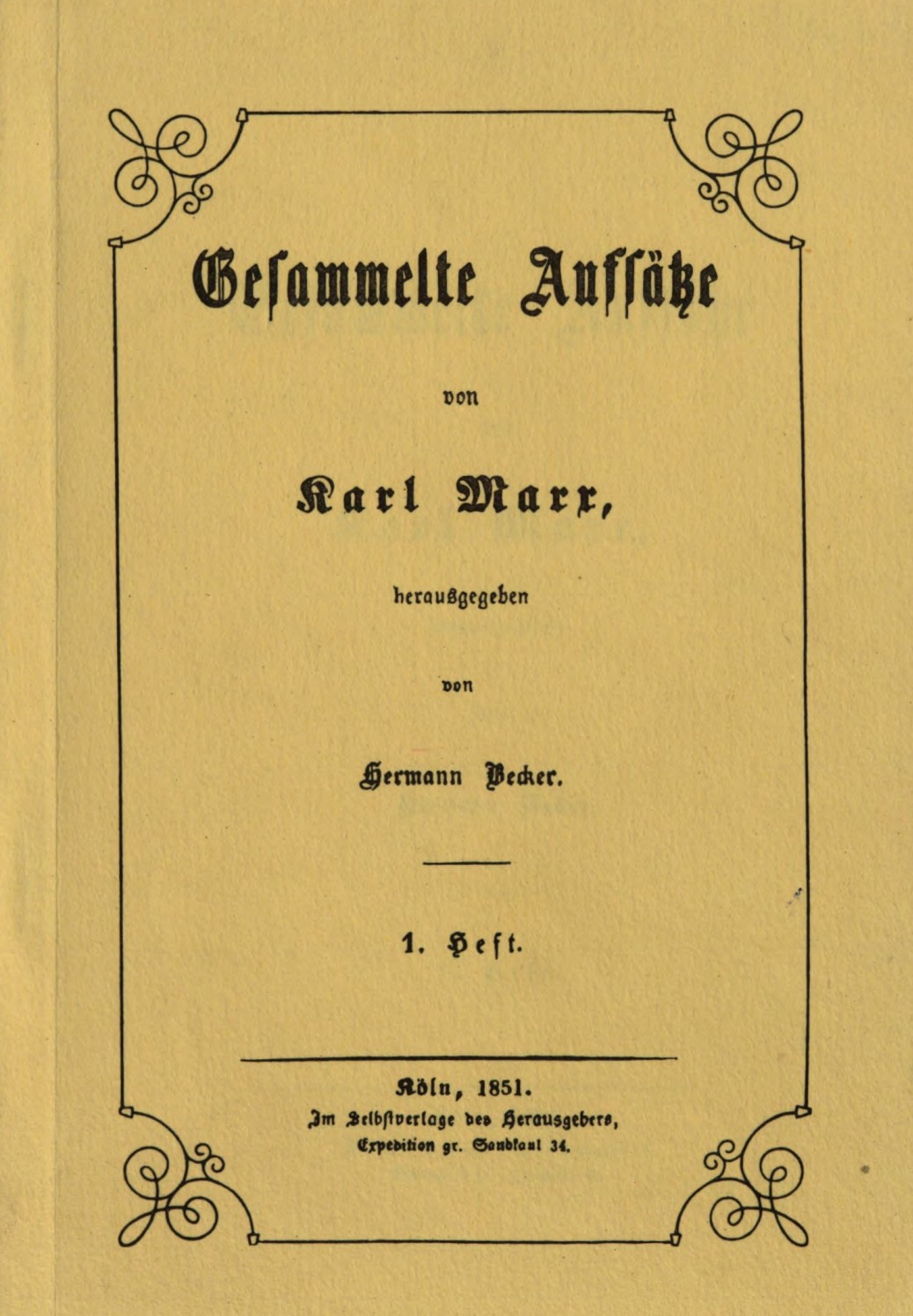 Marx, Karl 1851, Gesammelte Aufsätze. 1. Heft, editado por Hermann Becker, Colonia: [Edición privada].