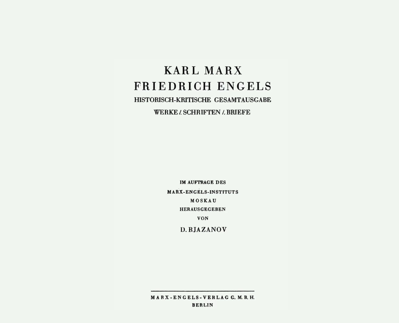 El proyecto se garantizó mediante acuerdos entre el Instituto Marx-Engels de Moscú y el Instituto de Investigación Social de Fráncfort del Meno, bajo la dirección de Carl Grünberg, así como mediante la creación de la Sociedad Editorial Marx-Engels (Marx-Engels-Verlags-Gesellschaft), más tarde Marx-Engels-Verlag, con sede en Berlín.2.9 Sobre esta base, Riazanov comenzó en Moscú la edición de una serie prevista de 42 volúmenes, que se publicó en Fráncfort del Meno y Berlín y, a partir de 1933, se imprimió en Leningrado. Entre 1927 y 1941 se publicaron doce volúmenes. En este marco, se publicaron una serie de primeras ediciones, primero en el Marx-Engels-Archiv en 1925 y más tarde en MEGA, que estimularon especialmente los estudios de crítica social, como el capítulo sobre Feuerbach de la Ideología alemana y la Dialéctica de la naturaleza de Engels, luego los Manuscritos de 1844 2.10 y la Ideología alemana.2.11 En particular, los llamados escritos tempranos provocaron un debate sobre la alienación y la reificación en el capitalismo. En 1939, los Grundrisse se publicaron por primera vez como volumen especial en la MEGA; su impacto en la investigación sobre Marx no se produjo hasta la reedición de la RDA en 1953.