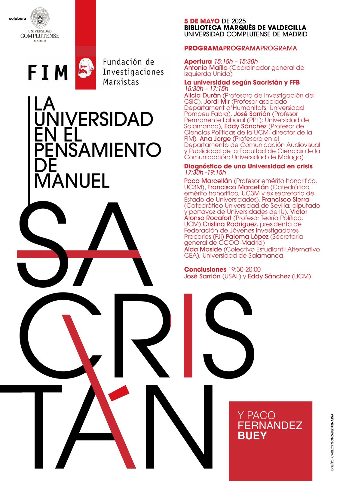 En el marco del «Año Sacristán», la Fundación de Investigaciones Marxistas (FIM) organiza la jornada «La Universidad en el pensamiento de Manuel Sacristán y Paco Fernández Buey», que se celebrará el lunes 5 de mayo de 2025 en la Biblioteca Marqués de Valdecilla – UCM (Calle Noviciado 3, Madrid). El evento abordará la crisis de la universidad contemporánea, la mercantilización del conocimiento y las reflexiones de Sacristán y Fernández Buey sobre el papel de la institución académica en la sociedad.
