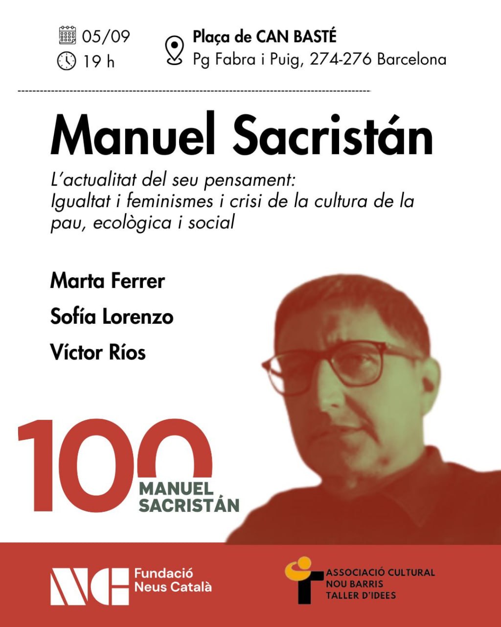 L’activitat s’intitula «Manuel Sacristán. L’actualitat del seu pensament» i està dedicada a explorar la profunda vigència de les idees d’aquest filòsof en el context dels grans reptes contemporanis. L’acte se centrarà a analitzar com la seva obra dialoga amb temes crucials del nostre temps, com la lluita per la igualtat i els feminismes, així com les múltiples crisis que defineixen l’era actual: la crisi de la cultura de la pau, la crisi ecològica i la crisi social. Per aprofundir en aquestes qüestions, comptarà amb les intervencions de les ponents Marta Ferrer, Sofia Lorenzo i Victor Ríos. Aquesta jornada de debat i reflexió està organitzada de manera conjunta per la Fundació Neus Català i l’Associació Cultural Nou Barris Taller d’Idees.