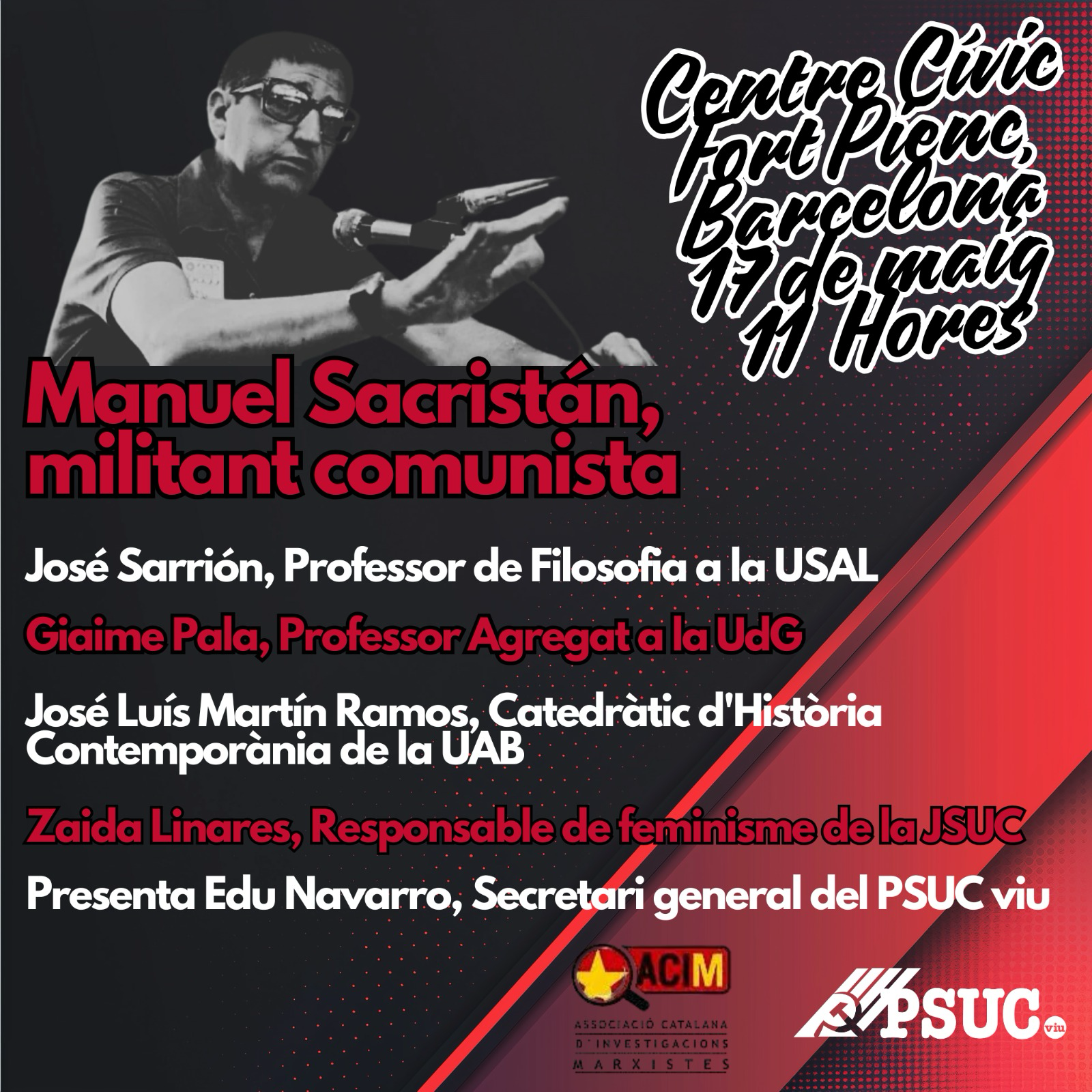 El próximo 17 de mayo, el PSUC-Viu y la Asociación Catalana de Investigaciones Marxistas (ACIM) celebrarán un acto conmemorativo dedicado al pensamiento y la práctica política de Manuel Sacristán, una de las figuras clave del marxismo crítico en el siglo XX español. El evento tendrá lugar en el Espai Fort Pienc (Barcelona) de 11:00 a 14:00 horas.