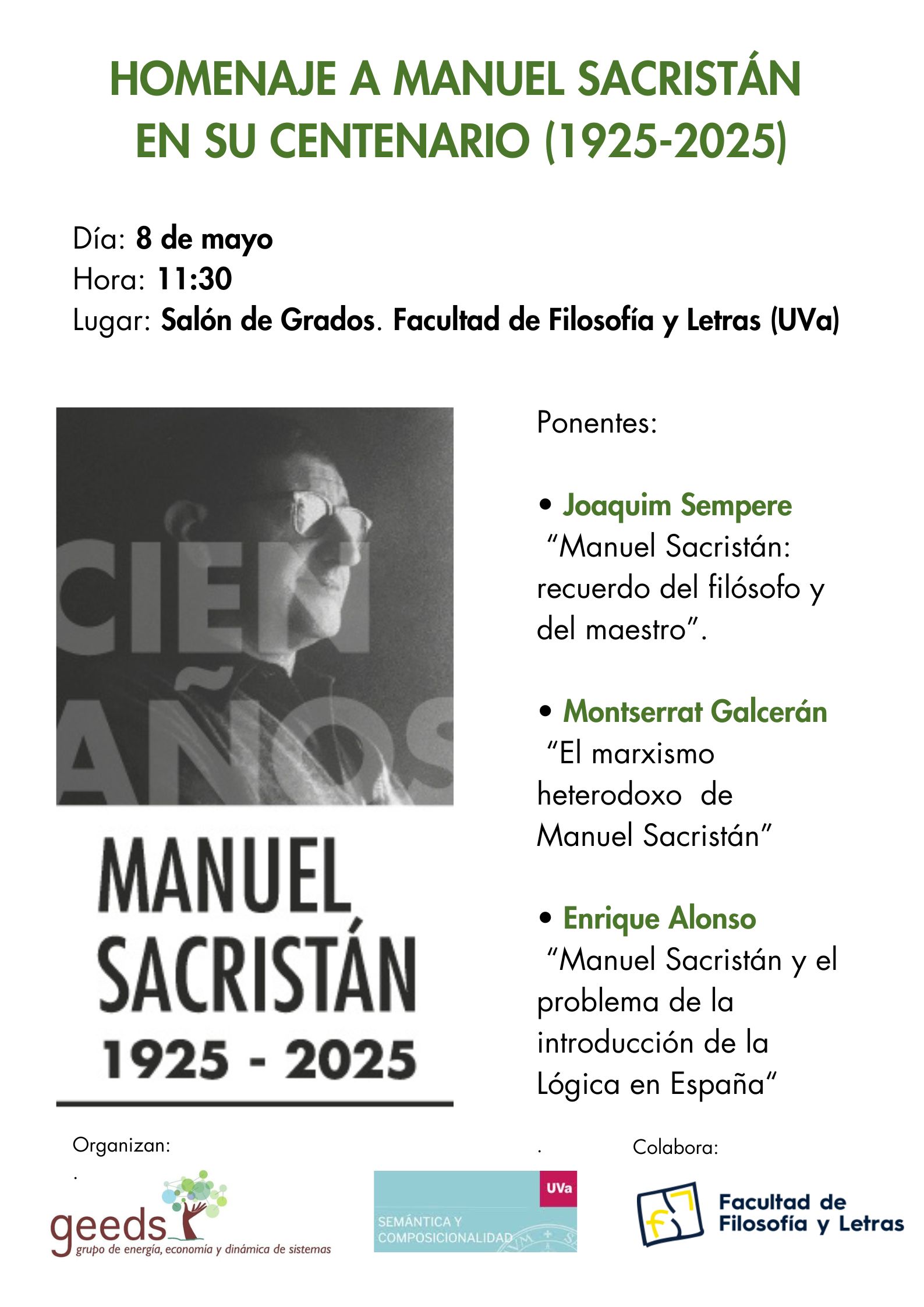 La jornada está organizada por el grupo GEEDS (Grupo de Energía, Economía y Dinámica de Sistemas) y el proyecto “Semántica y Composicionalidad”, con la colaboración de la Facultad de Filosofía y Letras de la UVa.