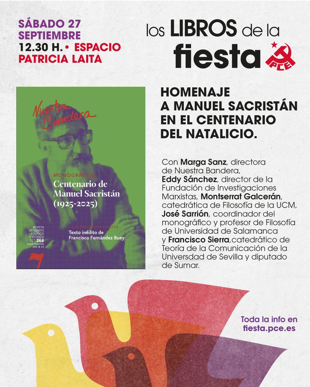 La Fiesta del PCE acogerá este año la presentación pública del monográfico de Nuestra Bandera dedicado a Manuel Sacristán, en el año de su centenario. La cita será el sábado 27 de septiembre, a las 12 de la mañana, en el espacio de debates de la Fiesta.